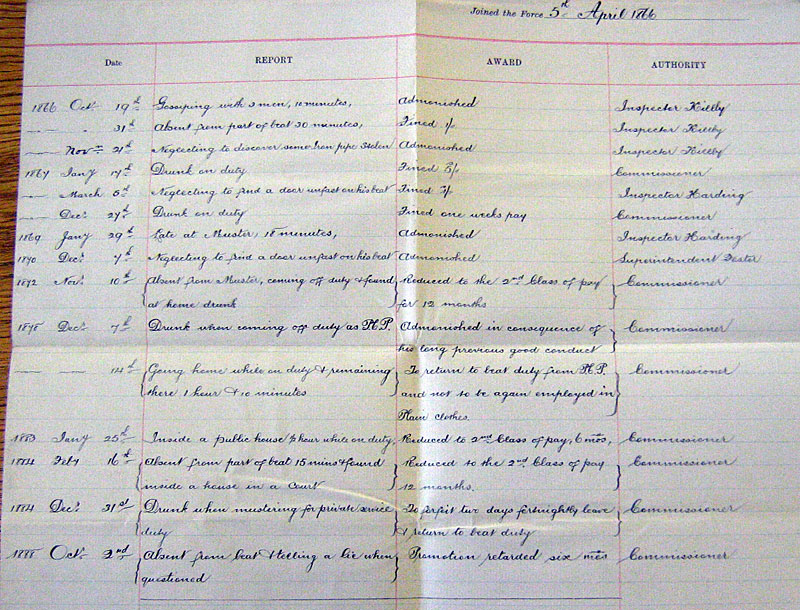 | Richard's employment history within the MET showing several punishments for being drunk as well as some rewards for good police work. It should be noted that some of the drunk "episodes" roughly correllate to the deaths of some of his children, notably in 1878. |